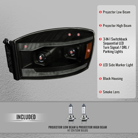 2006–2008 Dodge RAM 1500 / 2006–2009 RAM 2500 3500 Projector Headlights with Switchback Amber LED Strips, Sequential Turn Signals, DRL & Startup Animation (Black Housing / Smoked Lens)