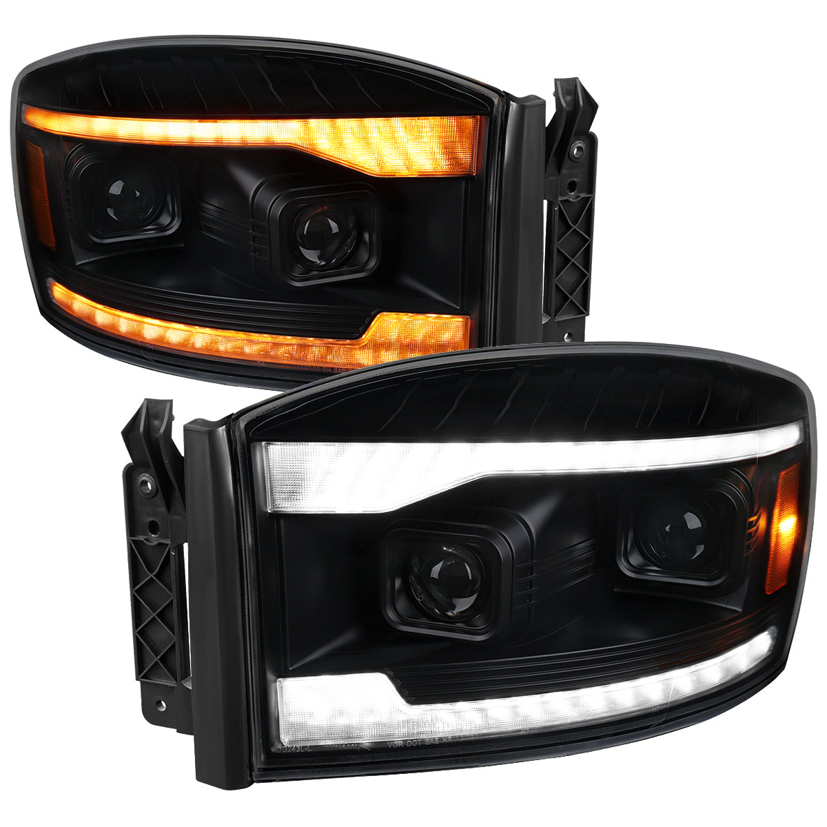 2006–2008 Dodge RAM 1500 / 2006–2009 RAM 2500 3500 Projector Headlights with Switchback LED Strips, Sequential Turn Signals, DRL & Startup Animation (Black Housing / Smoked Lens)
