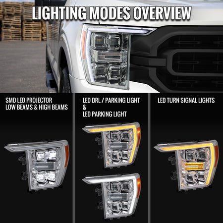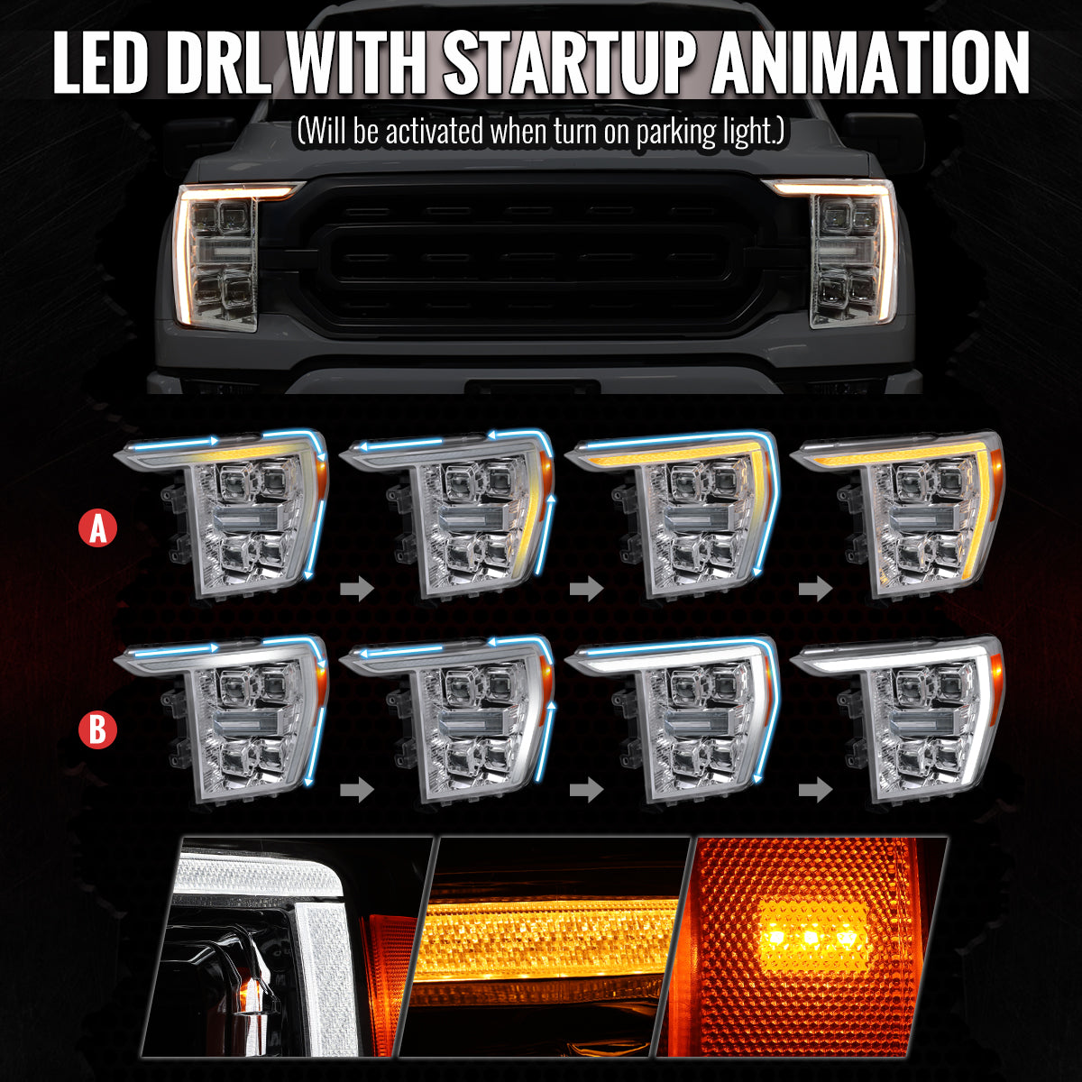 2021-2023 Ford F-150 Full LED Projector Headlights w/ Switchback LED Sequential Turn Signals DRL Parking Light Strip (Chrome Housing / Clear Lens) - Fits Models w/ Factory LED Headlights