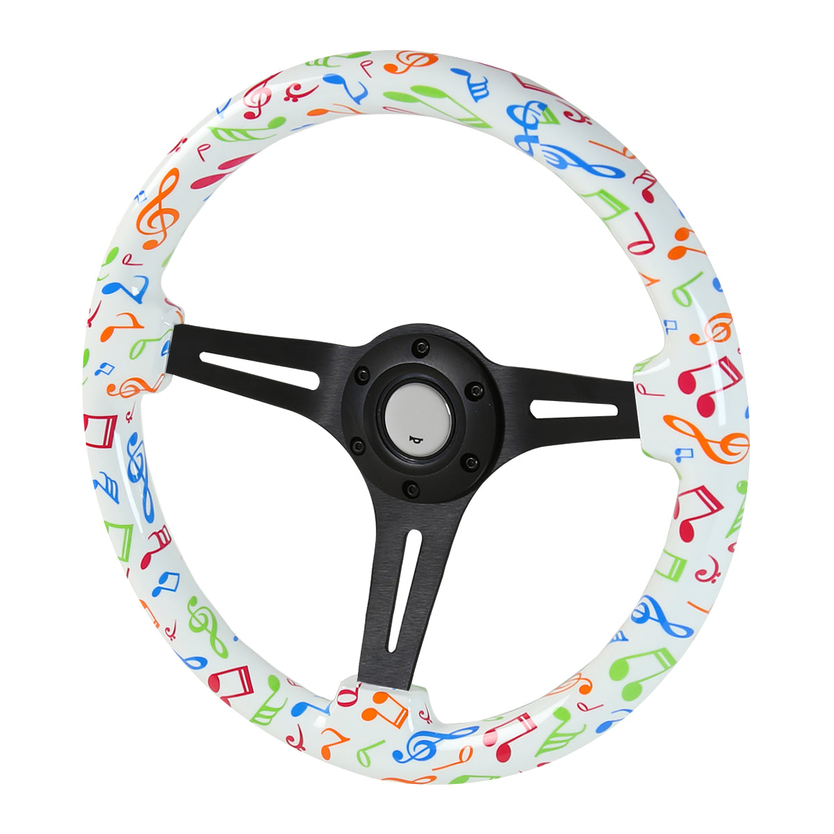 350mm 3-Spoke Musical Notes 2" Deep Dish Wooden Steering Wheel (Black)